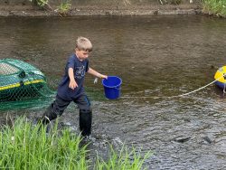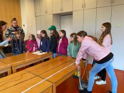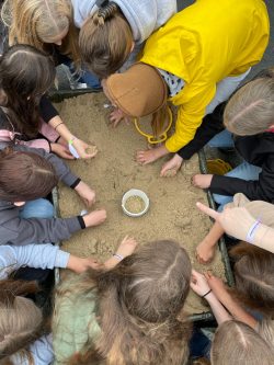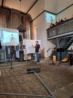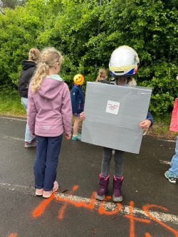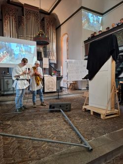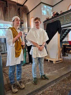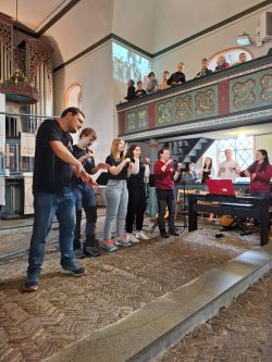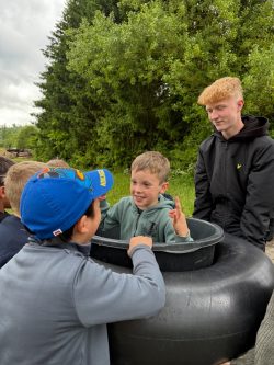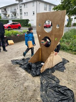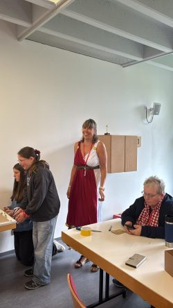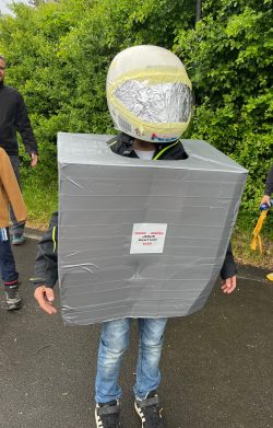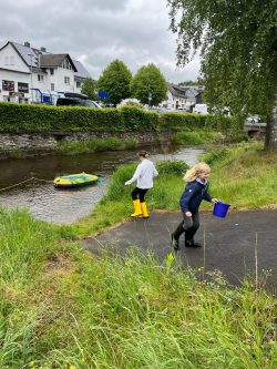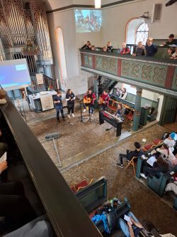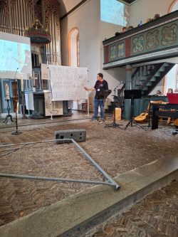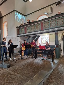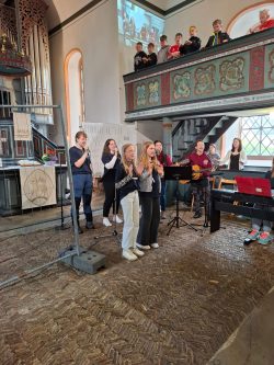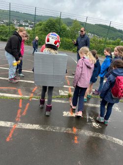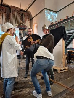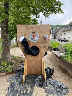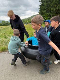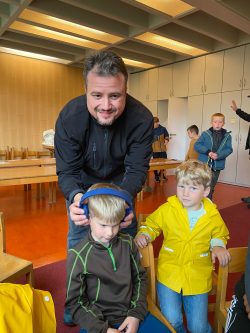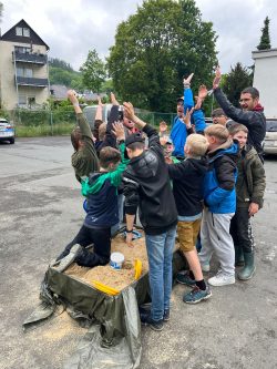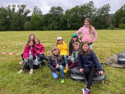Vom Frühstück gestärkt haben wir unseren Jungschartaggottesdienst in der Kirche in Eibelshausen gefeiert, da der Regen den Gottesdienst auf der Osterwiese leider nicht zugelassen hat. Aber unsere Gebete wurden erhört und der liebe Gott hat mal wieder gezeigt, dass er ein Eibelshäuser ist, und uns während der Spiele eine große Regenpause geschenkt hat. So konnten wir uns auf das Abenteuer Zeitreise begeben und in zwölf Stationen verschiedene Zeitepochen erleben. Vom Fischfang zur Zeit Jesu in der Dietzhölze, über das Übersetzen der Bibel ins Deutsche in der Kirche, die Französische Revolution und das Anprangern der Gruppenmitarbeiterinnen und -mitarbeiter mit Schwämmen, verschiedene Spiele zum letzten Jahrhundert, wie dem Heuballentransport, das Goldgräberspiel, die Nutzung von Wählscheibentelefonen und dem Aufwickeln von Kassettenbändern bis hin zur Zukunft mit „Alexa, lauf!“ und in die Zukunft mit der Ufo-Reise war alles dabei.